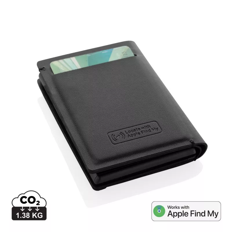Bezprzewodowy lokalizator portfela Seekcard, wykonany z certyfikowanego recyklingowanego poliestru RCS i aluminium, obsługa technologii Apple Find My, powiadomienia o zgubieniu portfela, funkcja precyzyjnego lokalizowania na całym świecie, wbudowany dźwiękowy sygnał naprowadzający, akumulator ładowany bezprzewodowo, czas pracy do 6 miesięcy po godzinnym ładowaniu, miejsce na 3 karty oraz dodatkową przestrzeń, opakowanie prezentowe FSC® mix
