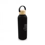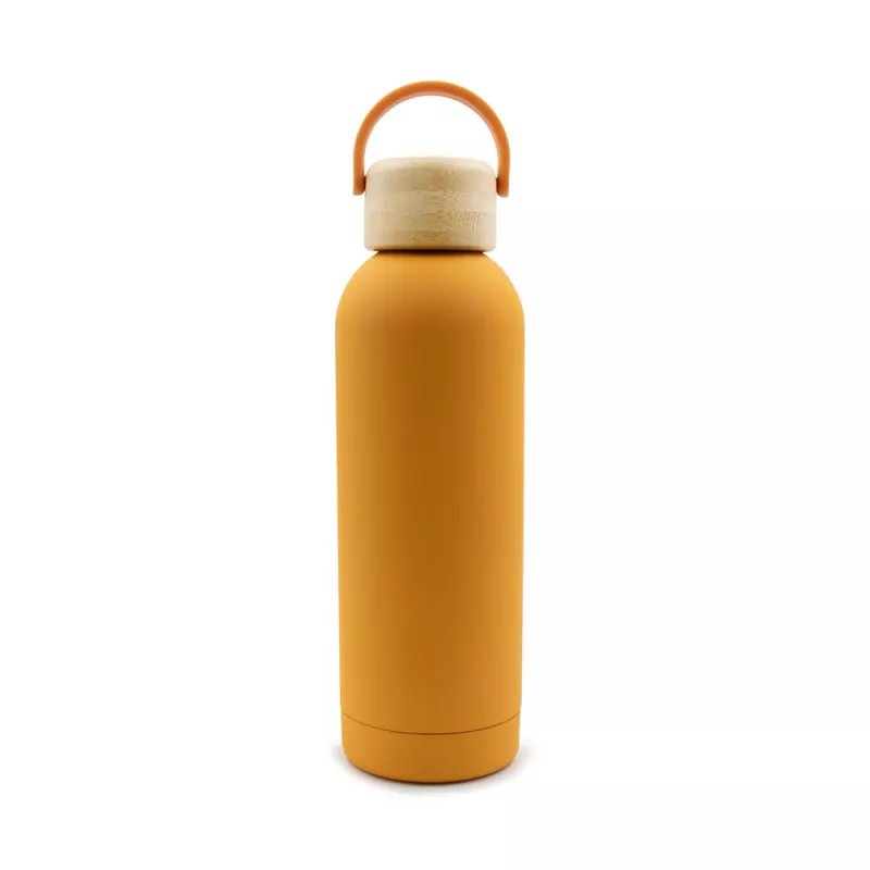 Butelka termiczna 500 ml, posiada podwójne ścianki ze stali nierdzewnej z próżnią między ściankami, co spowalnia oddawanie temperatury na zewnątrz, zachowując funkcje termosu, gumowe wykończenie, bambusowa zakrętka ze składanym uchwytem wykonanym z silikonu ułatwiającym noszenie, produkt wykonany ze stali nierdzewnej, plastiku i bambusa, klasa termiczna: A +leakproof